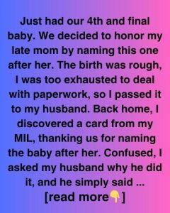 Just had our 4th and last baby. We named this after my late mother. I gave my husband the paperwork because I was fatigued from the birth. Back home, I found a card from my MIL congratulating us for naming the baby after her. Curious, I asked my husband why, and he responded, ‘It felt right in the moment.’
