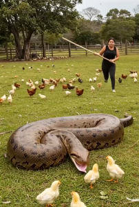 The terrified chicks scattered in all directions, chirping frantically as the snake struck with lightning speed. In that critical moment, the farmer, who had been tending nearby, noticed the danger and rushed into action. Armed with nothing more than a sturdy stick, he confronted the reptile head-on.