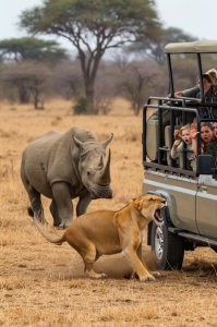 The clash between two of Africa’s most iconic creatures created a moment that left tourists gasping, wide-eyed, and clutching their seats. What began as a nerve-racking close encounter quickly transformed into a breathtaking display of raw power and survival instinct.